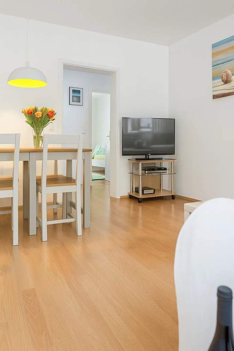 Unsere Wohnung verfügt über ein geräumiges Wohn- und Esszimmer mit einer komplett ausgestatteten Küchennische. Eine Kaffeemaschine, ein Wasserkocher und eine Spülmaschine stehen Ihnen zur Verfügung, um die Zubereitung köstlicher Urlaubsgerichte zu erleichtern. Ein großer Flachbildfernseher, ein DVD-Spieler und kostenloses WLAN sorgen für Ihre Unterhaltung.
